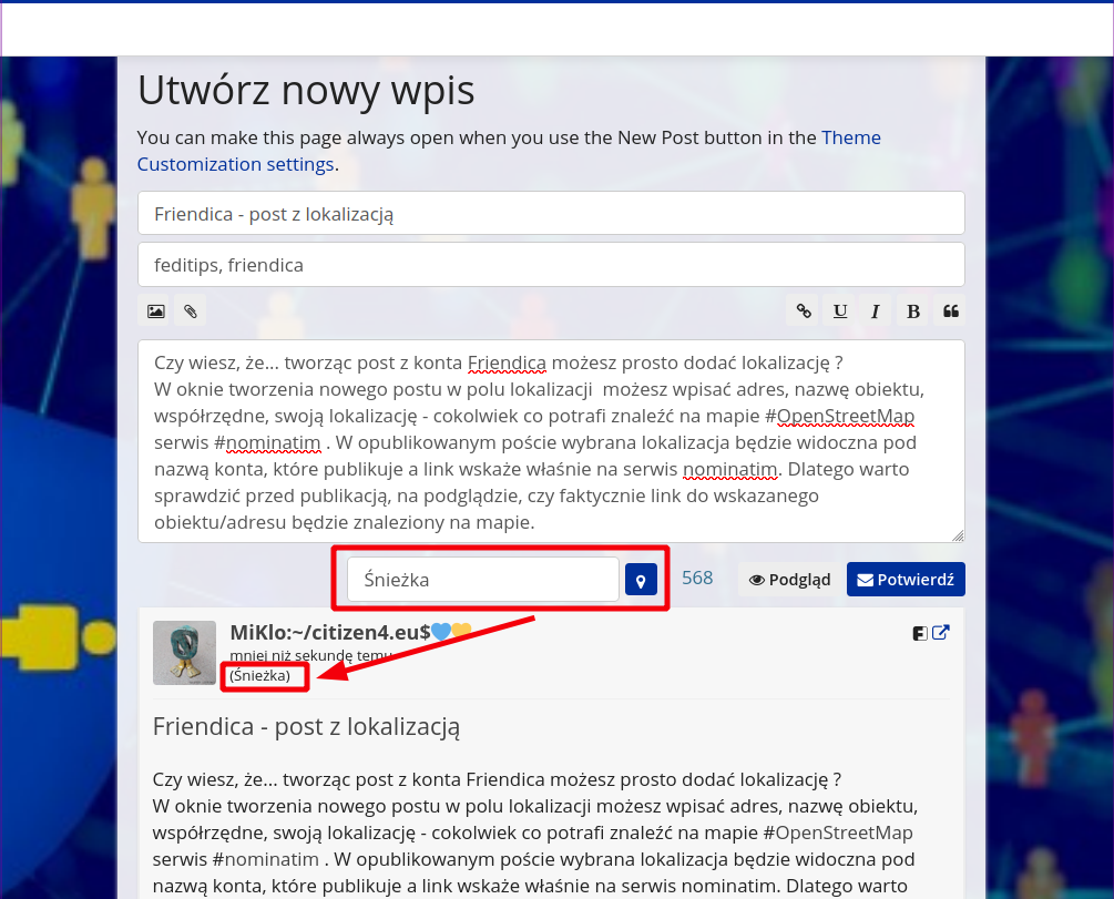 Czy wiesz, że... tworząc post z konta Friendica możesz prosto dodać lokalizację ?