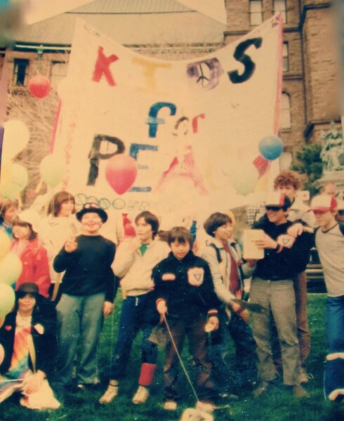 ALP kids and Kids for Peace banner, ca 1983, Queen's Park, Toronto, Ontario, Canada