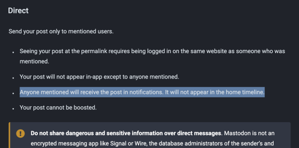 Bądź pewien, że rozumiesz, jak działają "prywatne wiadomości" (bezpośrednie do kogoś) na Mastodon. One niekoniecznie są prywatne i wysyłane wyłącznie do odbiorcy tak jak na Twitterze. Jeśli wspomnisz o użytkowniku Y w „bezpośredniej wiadomości” do użytkownika X, to ten użytkownik Y również to będzie widział! Niespodzianka. https://docs.joinmastodon.org/user/posting/