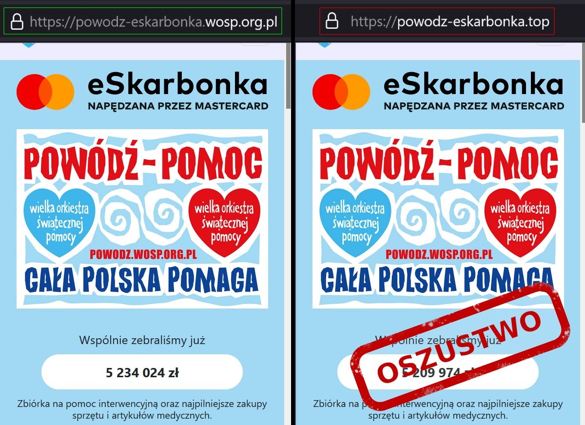 •Prawdziwa zbiórka jest dostępna pod adresem https://powodz-eskarbonka.wosp.org.pl, fałszywa mieści się w domenie .top (niewykluczone, że istnieją też inne podróbki). WOŚP umożliwia dokonywanie wpłat na kilka różnych sposobów. Na stronie stworzonej przez oszustów dostępna jest tylko płatność kartą.