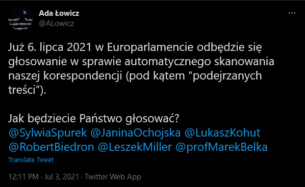 Już 6. lipca 2021 w Europarlamencie odbędzie się głosowanie w sprawie automatycznego skanowania naszej korespondencji (pod kątem “podejrzanych treści”). Pytam europosłów i europosłanki jak będą głosować...