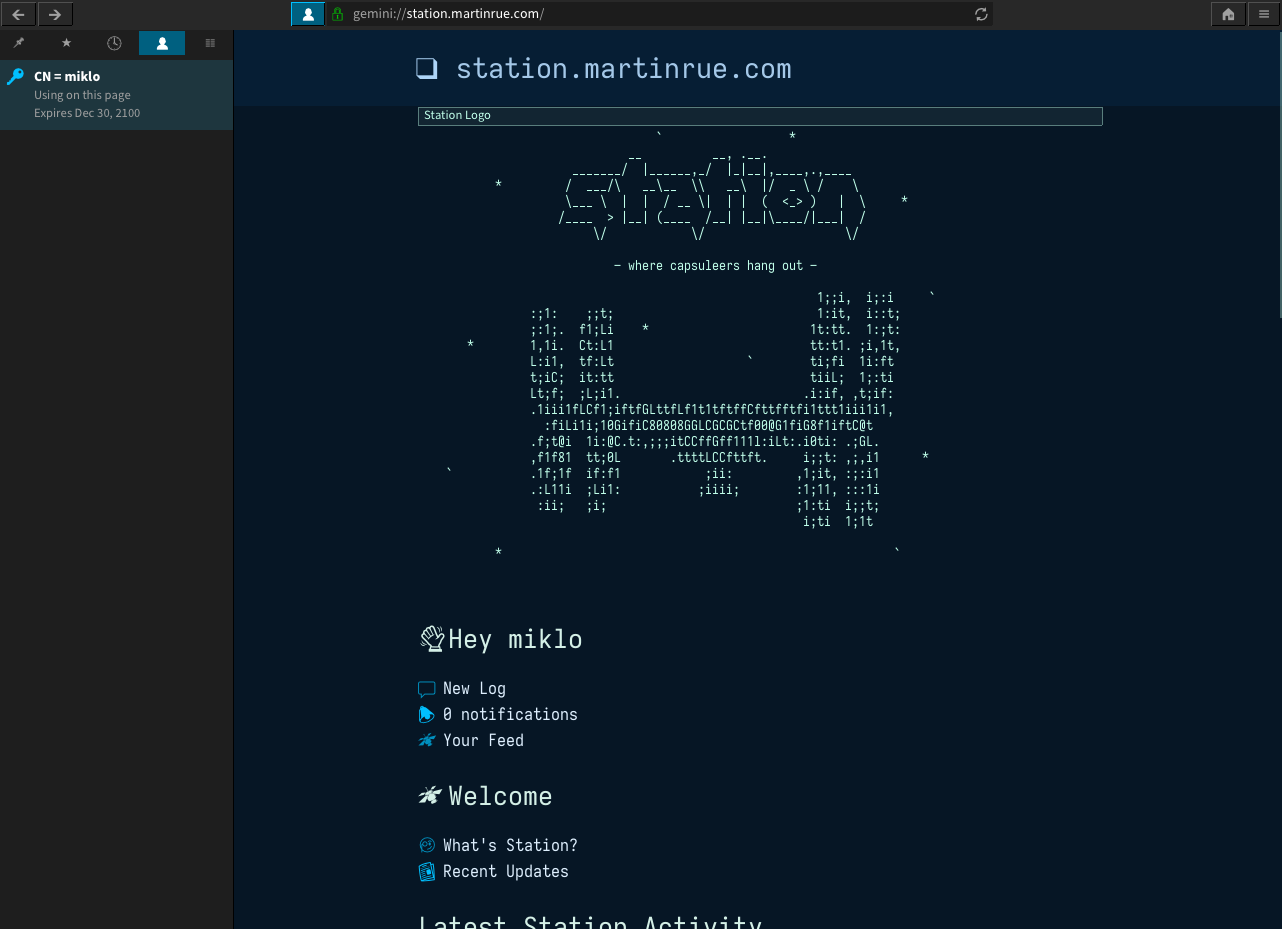 Pierwsze próby tworzenia serwisów społecznościowych w wirtualnym, tekstowym świecie dostępnym przez protokół #gemini. Pod adresem gemini://station.martinrue.com/ powstał serwis mikroblogowy. Identyfikację w gemini tworzymy sami generując w przeglądarce ( -> https://gemini.circumlunar.space/clients.html ) swój certyfikat.